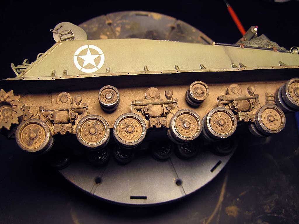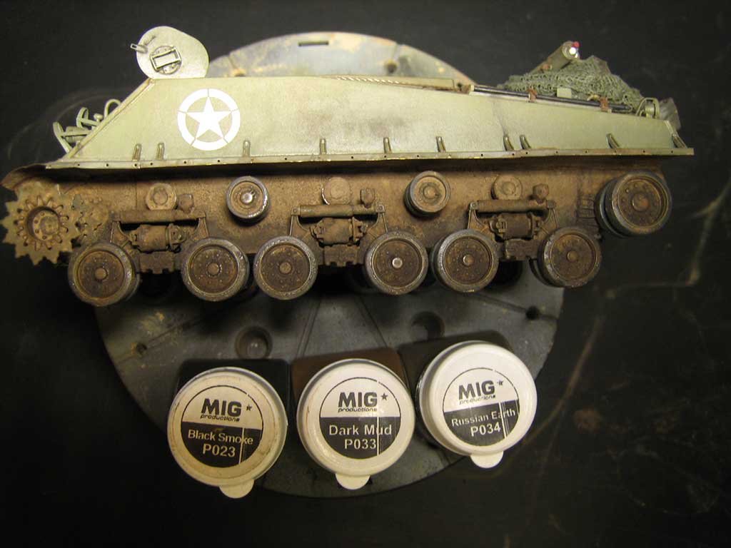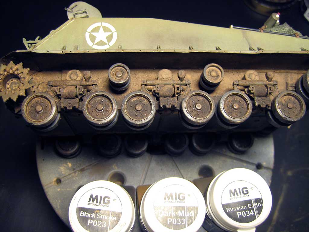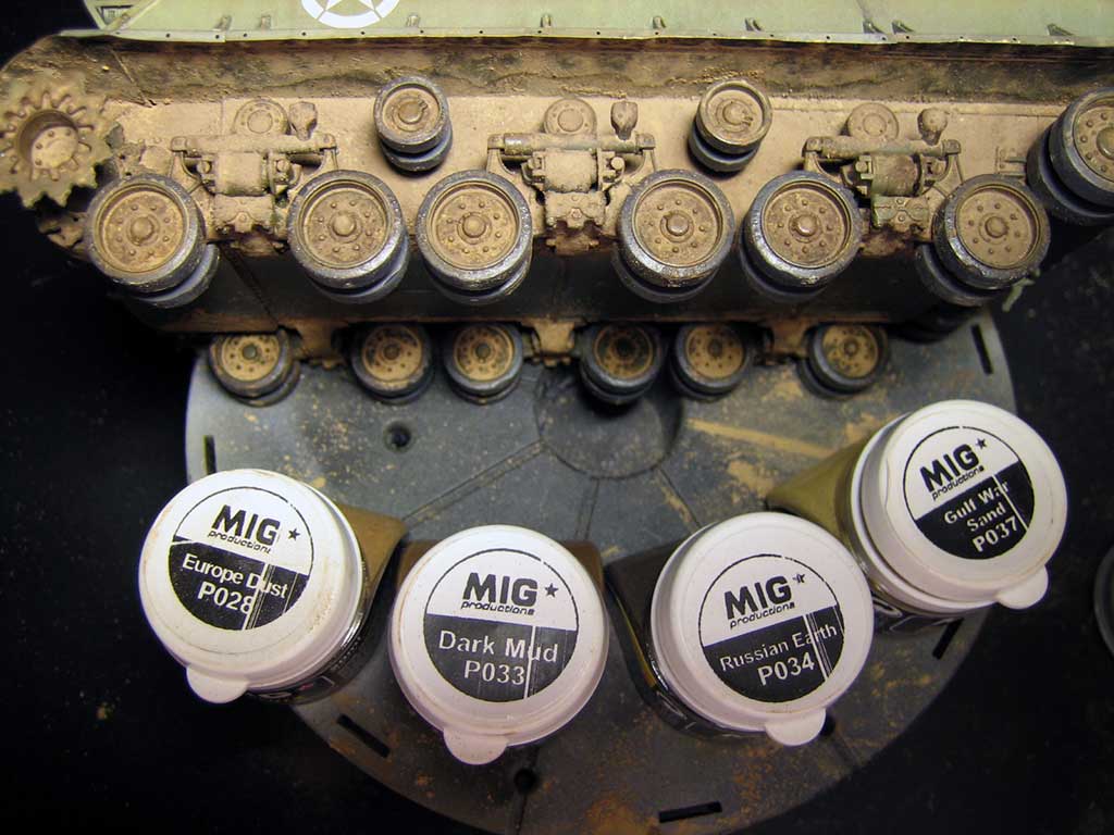 Benytt også samme fremgangsmåte med pigmenter i lag foran og bak på vogna , her kan man i tillegg også bruke f. eks. MIG dark wash for litt flekker og søl.